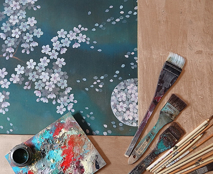 油彩を水彩のように使えないだろうか。そう思った時、15世紀の画家フラ・アンジェリコの聖画を思い出した。板を金泥で下塗りして描いた輝くばかりの絵である。試みに「科材」合板をエナメルの金でつぶし、磨いて、油絵具を薄く溶く。和刷毛と面相筆…描けるじゃぁないか。面相の滑りも良く、秋風になびく薄の穂波も描ける。まさに日本画の手法に近い感覚である。加えて薄い絵具の塗膜面を透かし、下地の金が外光に微妙に反射して、画面を独特の色合いに見せるではないか。背景に箔を置いた「琳派」の工夫も思い出される。